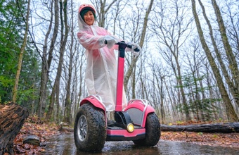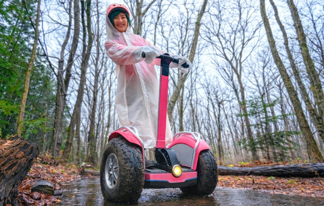 オフロード仕様の自立式電動立ち乗りボード「ジャイロライド」は、両足でボードに立ち、体を前に傾けると前進、後ろに傾けるとブレーキがかかります。左右の体重移動で自然に曲がることができ、ハンドル操作は不要。自分のバランス感覚だけで自由に操れるのが大きな魅力です。