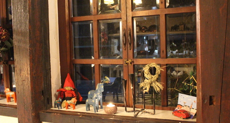 かやぶき屋根の家の入り口から中に入ると、スウェーデンのシンボルとなっている赤い馬、ダーラへストが出迎えます。室内には北欧のインテリアや食器が並べられ、壁にはスウェーデンのウォールペイントが描かれ、まるで北欧に旅したような気分に。