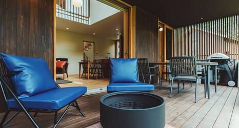 ラグジュアリーコテージの種類は「SAUNA」と「TAKIBI」の2種類。「SAUNA」は、プライベートサウナ付きで本格サウナが楽しめます。螺旋階段で2階の屋外デッキに移動すれば、富士山を望むととのいスペースで、外気浴と絶景を堪能できます。庭が主役の「TAKIBI」は、オリジナルのファイヤーサークルを中心にレンガで設えたピットまわりと、焚火を囲んで憩えるスペースを備えています。また、「TAKIBI」に宿泊の方は、リゾート施設内にある本場フィンランドスタイルの「CAMP SAUNA」も無料で利用できます。