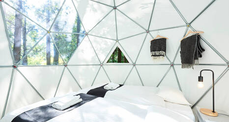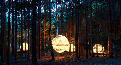 同施設は、30年以上にわたり愛されてきた林間学校「少年自然の家」を、現代的にリノベーション。森林に設置された球体型のテントは、施設のシンボル的存在です。浮遊感の中でベッドに寝転べば、天窓からは森の景色が広がります。日が落ちるとドームの明かりが森の中に浮かび、幻想的な雰囲気です。