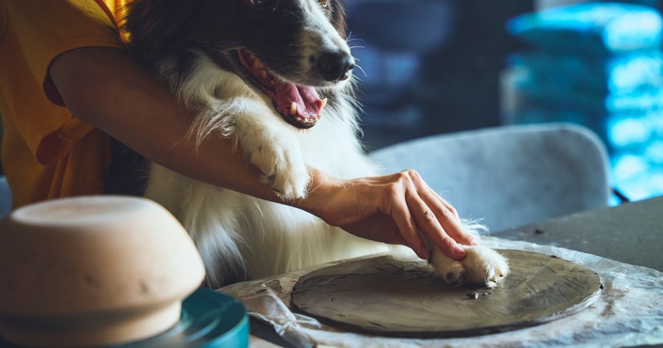 陶芸体験で作る皿は、近隣にある工房「匠宿(たくみしゅく)」に集まる伝統工芸の職人たちとともに考案されたもの。愛犬の足型(肉球)を押して完成するご飯皿は、愛犬との共同作業で生まれるかけがえのない作品です。