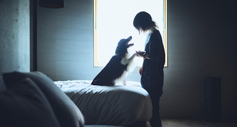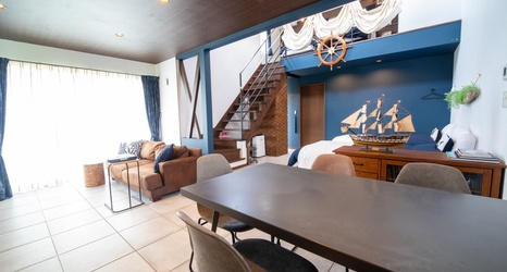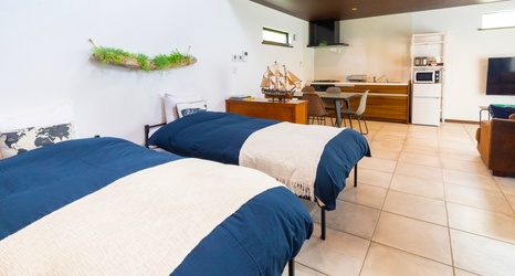 マナーパンツを愛犬に着用すれば、ベッドでの添い寝も可能です。普段使っているクッションなどを持ち込んでも良いでしょう。海辺で散歩したり、近隣ある犬同伴可能な飲食店などで楽しむことも。海沿いの別荘で愛犬と暮らすように過ごせる、開放感ある別荘です。