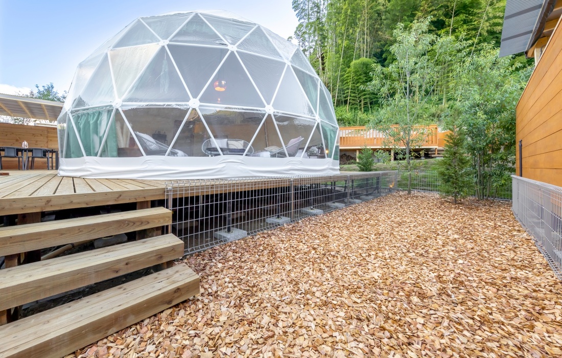 当コースで宿泊できるのは、ドーム型のテント「ドッグドームテント」、もしくはヴィラタイプの部屋「ドッグヴィラ」。予約時にお好みをお選びください。「ドッグドームテント」は大きな窓が特徴の開放感を感じる造り。隣には風呂やキッチンのあるキャビンがあり、グランピング気分を盛り上げます。テントの横にプライベートドッグランがあり、愛犬も外遊びを気軽に楽しめます。一方「ドッグヴィラ」は、施設を作る際に崩した山の杉やヒノキを使用し、温かみのある内装が特徴。部屋には暖炉があり、冬場は薪をくべて使用することができます。窓の外にはデッキを併設。窓とカーテンを開ければ、鳥の鳴き声や自然の音が聞こえ、部屋にいながら雄大な自然を感じられます。