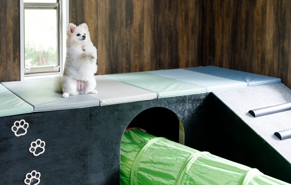 2つのベッドルームやシアタールーム、ドッグプレイルームがあるなど、ゆったりと豪華な作り。最大定員6人、愛犬は頭数無制限で宿泊できます。屋根付きのウッドデッキではバーベキューも可能です。また、屋外にはプライベートドッグランやプール、屋内のプレイルームにはトンネルやスロープなどの犬用遊具があったりと、愛犬家オーナーが手がけたからこその魅力です。