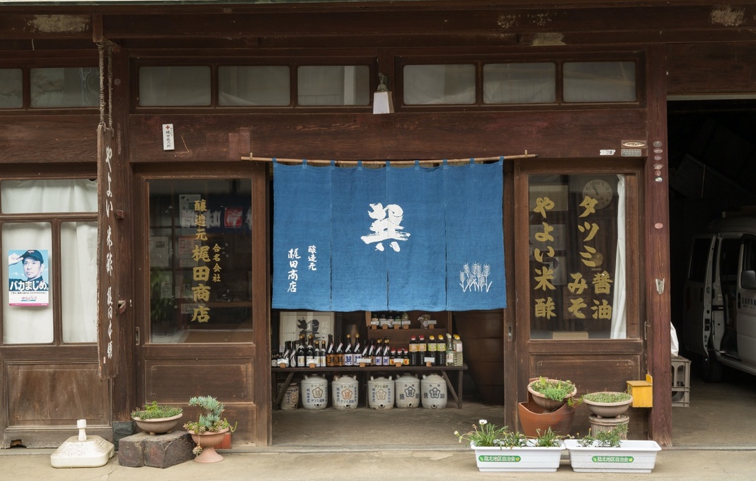 創業150年以上のしょうゆ蔵「梶田(かじた)商店」。創業以来、蔵に棲み付く蔵付き酵母で醸される天然醸造じょうゆのセットと、愛媛県南予(なんよ)地方ならではのおかずみそが届くコースです。