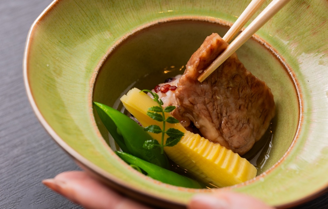 職人の技により厳選された素材のよさを存分に引き出された料理の数々でおもてなし。地元九州産を中心とした鮮度のいい旬の鮮魚や野菜を使用しています。特選黒毛和牛など、高級食材も織り混ぜられています。お米にもこだわりをもち、「九州産特A米」を一組ずつ土鍋で炊いて提供されます。
