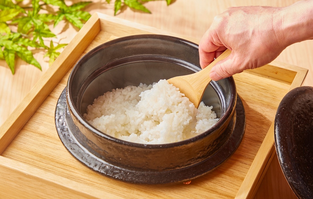 料理長が厳しく目利きし、極力シンプルな調理法で食材が持つ本来のおいしさを表現。一方で、新しい発想も取り入れ、新潟の食材のポテンシャルを引き出します。土鍋で炊いたごはんは、新潟県特別栽培認証米の胎内産クラシックコシヒカリ。生産者が手間暇かけて丁寧に栽培した、極めて希少なお米。しっかりとした粘りと甘みが特徴です。