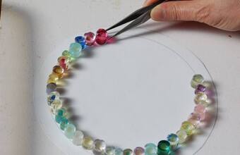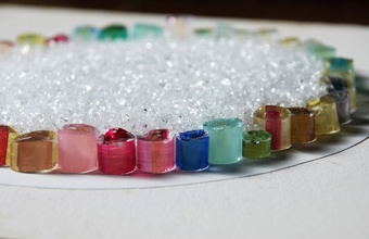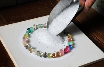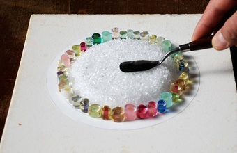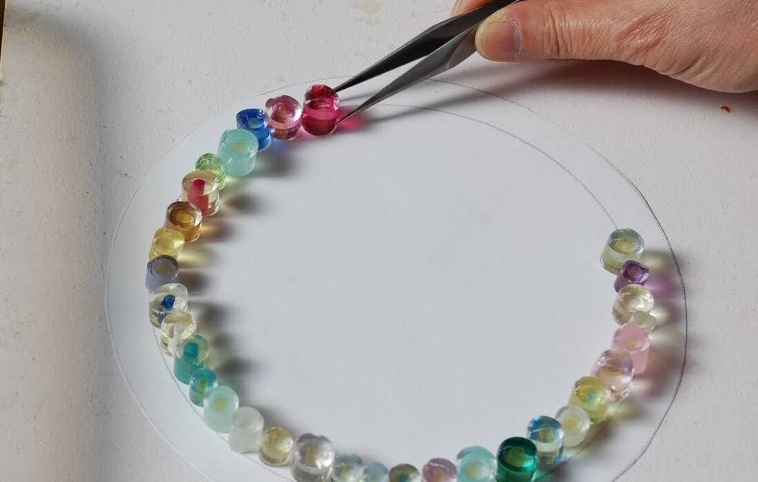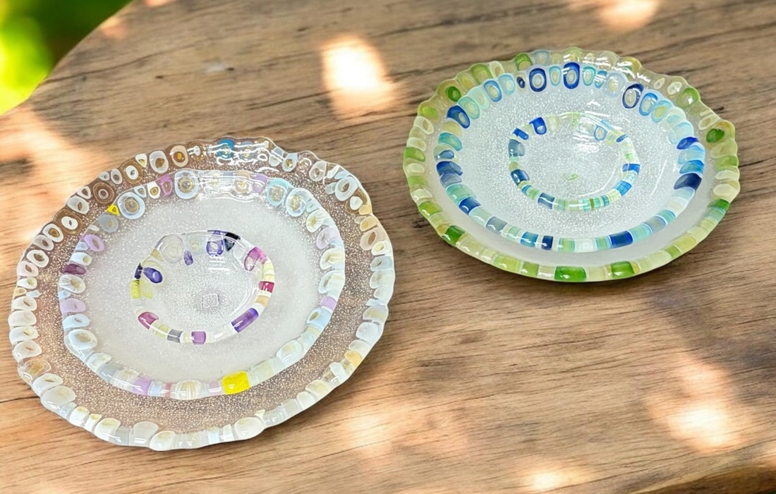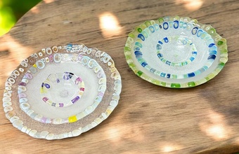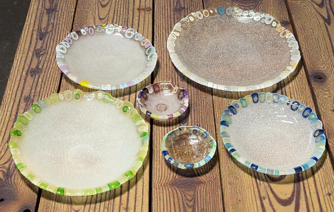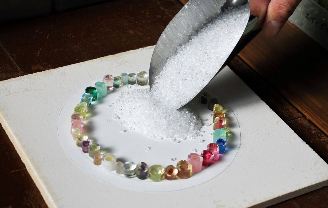 体験当日は、好きな色のパーツを集め、選んだパーツを耐熱紙に隙間なく並べます。そして真ん中にカレット(ガラス粒)を入れるだけで完成。浅めの皿、深めのボウルといった器の形状や、透明、艶消しといった表面加工を選び、後日、電気炉で焼き上げます。