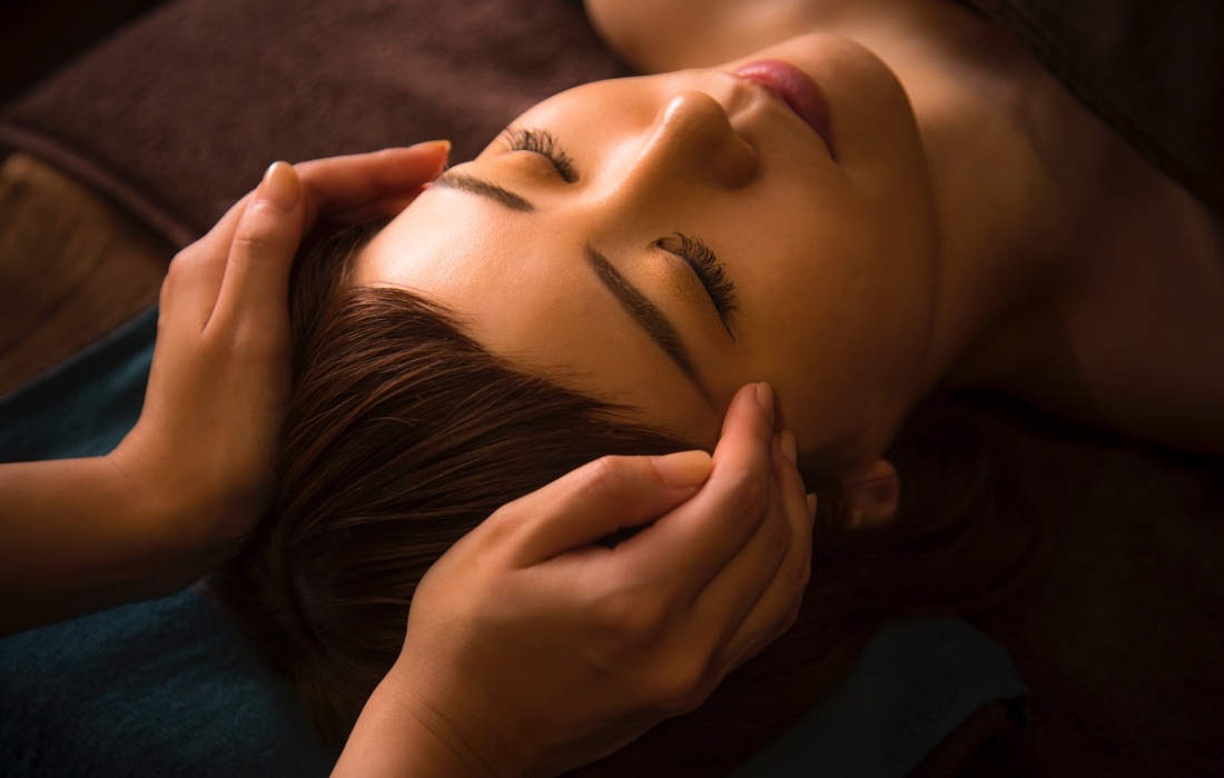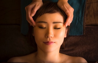 デコルテから首・肩、最後は頭・顔周りにかけて、オールハンドで丁寧にほぐします。顔や頭のツボをゆっくり押しながら、疲れが溜まりやすい目元の緊張を緩めていきます。施術中は、目元を温めるホットパックを使用。ゆるめた目元をほどよく温め、リラックスへと導きます。