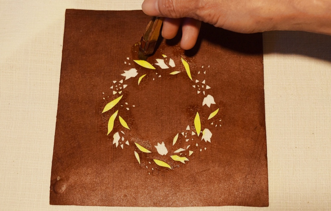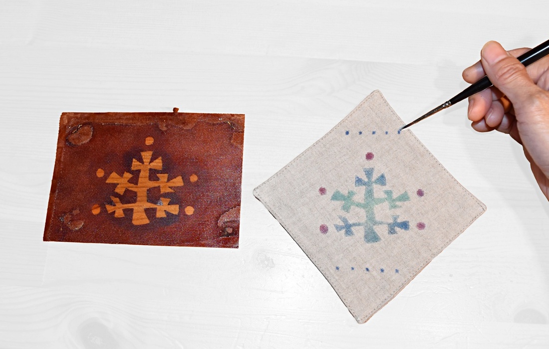 当コースでは、妻・純子さんの指導のもと、オリジナルデザインの型紙を使ったステンシル染めによる、世界に一つだけのコースター作りを体験できます。