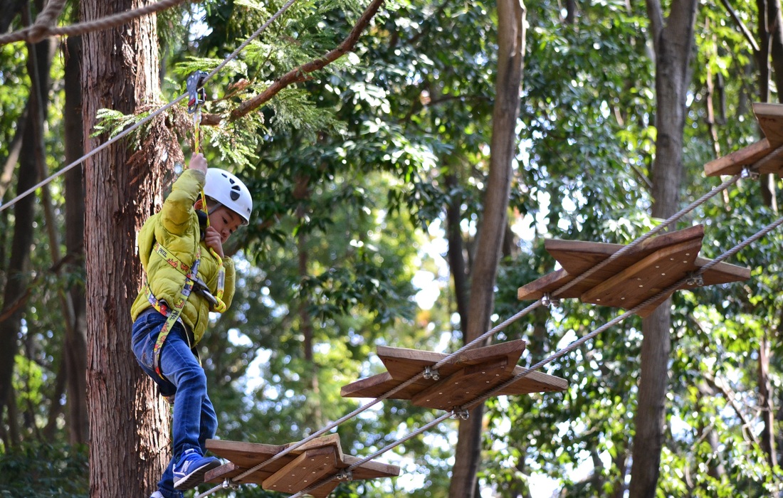 「フォレストアドベンチャー」とは、森の中の空中を渡っていくフランス発祥のアウトドアパークです。専用のハーネスを着用して木の上に登り、渡り、滑り降り、樹上で思いっきり体を動かします。