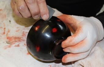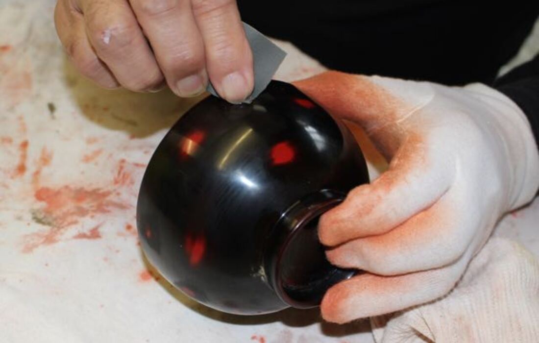 漆(うるし)の研ぎ出しとは、赤と黒の2色重ねて塗られた漆を水ペーパーを使用し表面を削ることで、下に塗った漆の色を出して模様を出すことです。