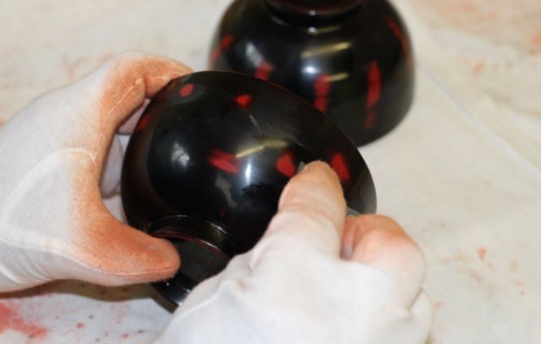 赤の下には黒、黒の下には赤の漆が塗られています。