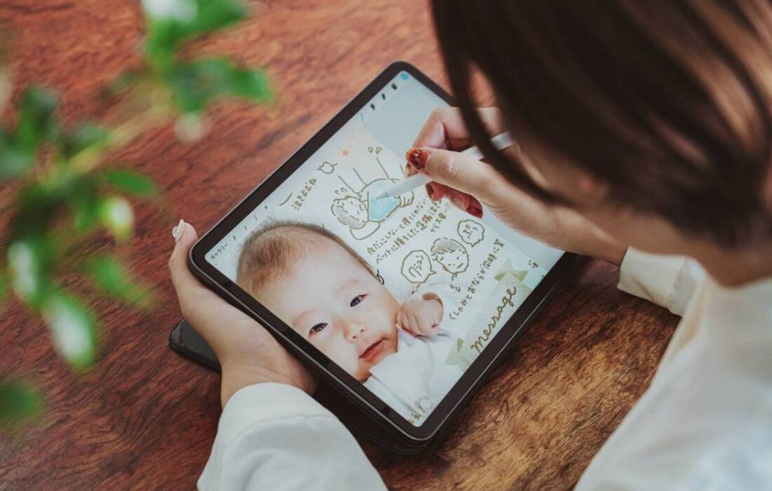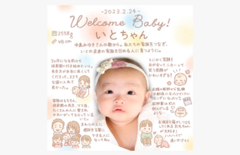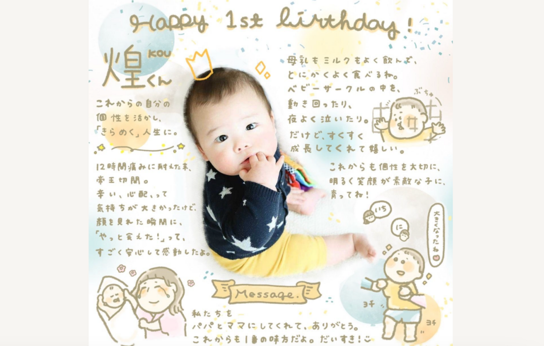 赤ちゃんが産まれると増えていくたくさんの写真、そしてあっという間に過ぎていく思い出の日々……。「べびしゃ」は、お気に入りの写真の上に、指名したアーティストが絵や文字を描いてくれるサービスです。写真に収められなかったあふれる思い出を、生涯色褪せない一枚の作品として残せます。