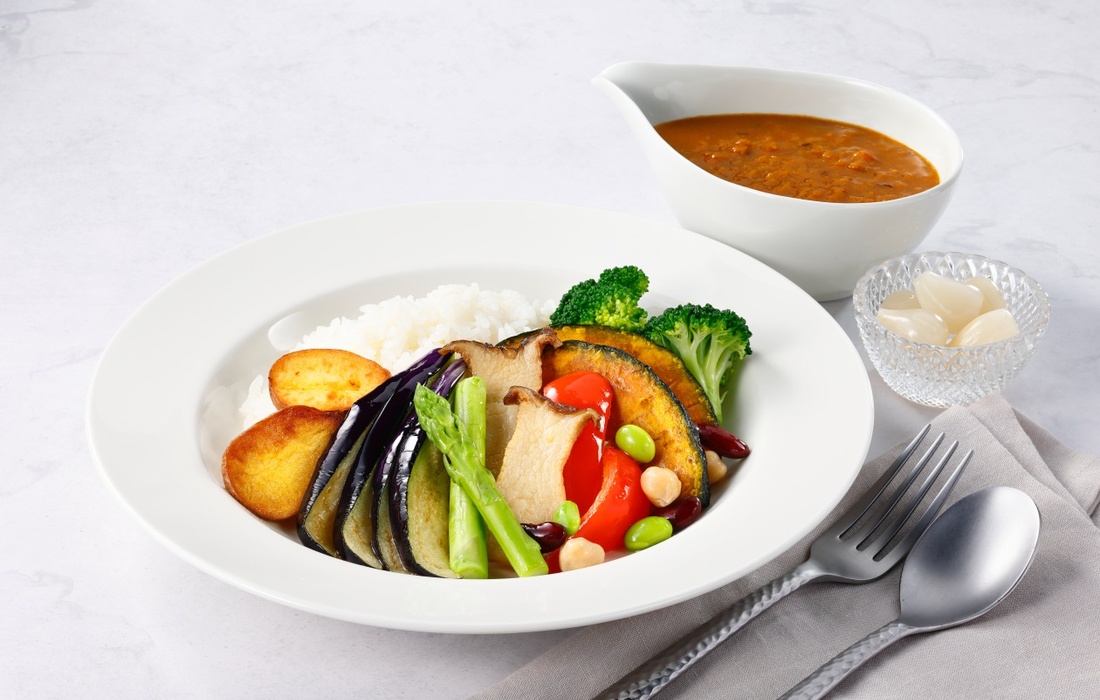 人参と玉ねぎのみじん切りをバターでしっかりとソテーし、野菜の旨みを十分に引き出した帝国ホテル伝統のカレーソースは、素材の旨みと食感を存分にお楽しみいただけます。なす、じゃがいも、ブロッコリー、パプリカ、アスパラガス、エリンギ、かぼちゃ、ミックスビーンズなどの彩り鮮やかな10種類の野菜とともにお召し上がりください。