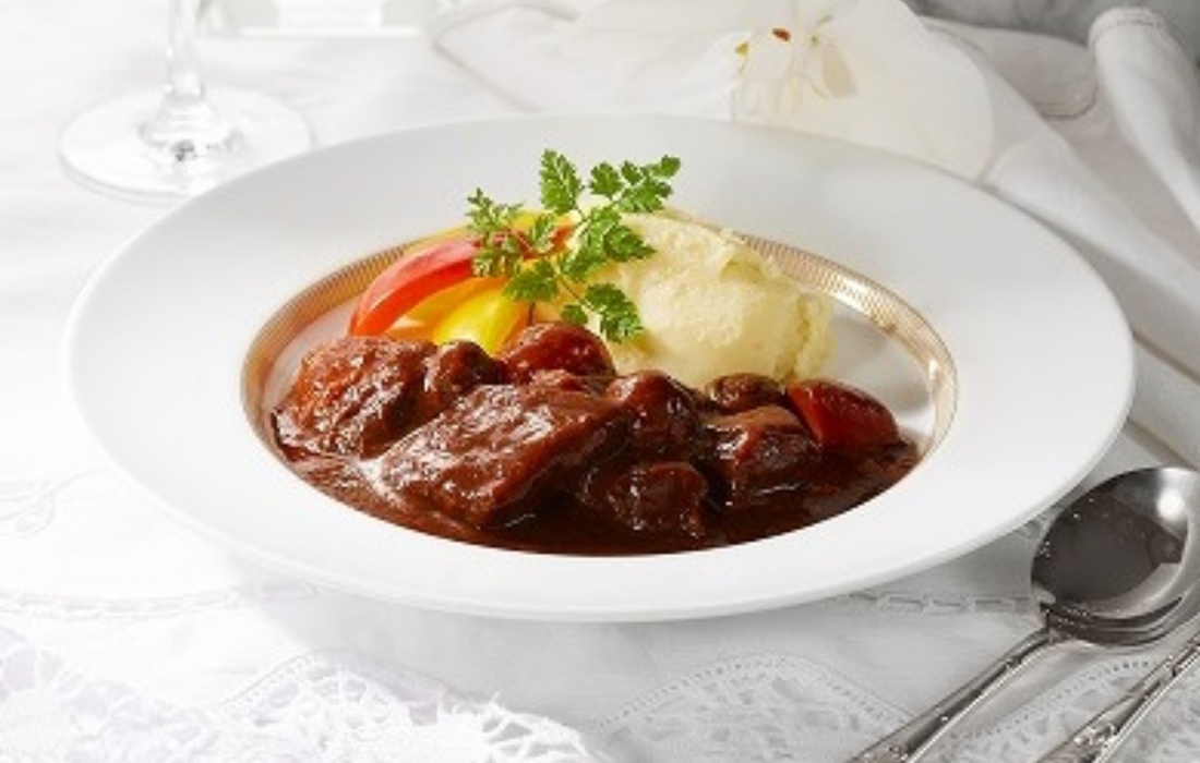 フォンドヴォーとデミグラスソースをベースに、香味野菜やワインを加えて煮込んだまろやかなコクと芳醇な香りのシチューソース。黒毛和牛のばら肉は、表面を焼いて香りを引き出しゆっくり時間をかけて煮込みました。とろける食感をお楽しみください。