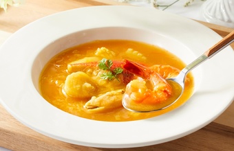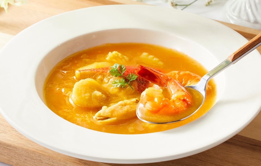 魚介類から出るエキスを充分に引き出したスープをベースに、丁寧に炒めたポロ葱とトマトを加えサフランで仕上げました。具材には金目鯛、ホタテ貝柱、エビ、いか、ムール貝を使用しており、魚料理としてもスープとしてもお楽しみいただけます。
