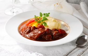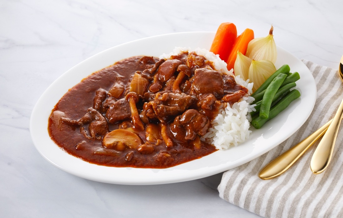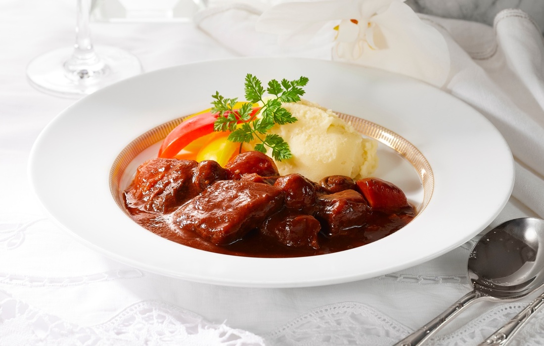 バターでソテーした黒毛和牛の薄切りを、ブランデーと赤ワインを加えて煮詰め、丁寧にソテーして歯応えを残したオニオンと、ぶなしめじとともにデミグラスソースで煮込みました。牛肉をソテーする際に出た旨みをデミグラスソースに加えることで、素材の美味しさを凝縮したソースに仕上げています。