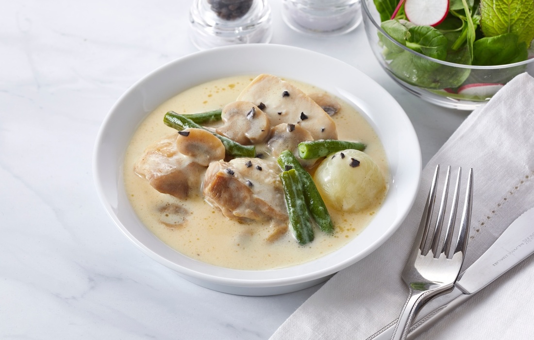 フランス語で「最高のソース」という意味を持つシュプレームソースをまとった国産鶏のソテーです。鶏肉とフレッシュのマッシュルームをそれぞれバターでソテーし、白ワインでデグラセした際に出たエキスで煮詰め、生クリーム、レモン汁、トリュフなどを加えて仕上げました。しっとりと柔らかな食感の鶏肉を、初代総料理長 村上信夫の時代からホテルで受け継がれるソースとともにご堪能ください。