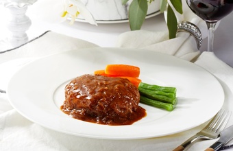 ビーフの旨みをとじこめたジューシーで味わい深いハンバーグです。帝国ホテル伝統のデミグラスソースをベースに仕上げた濃厚で優しい甘さのオニオンソースが、ハンバーグの旨みを一層引き立てます。お子様でも食べやすい柔らかい食感が特徴です。