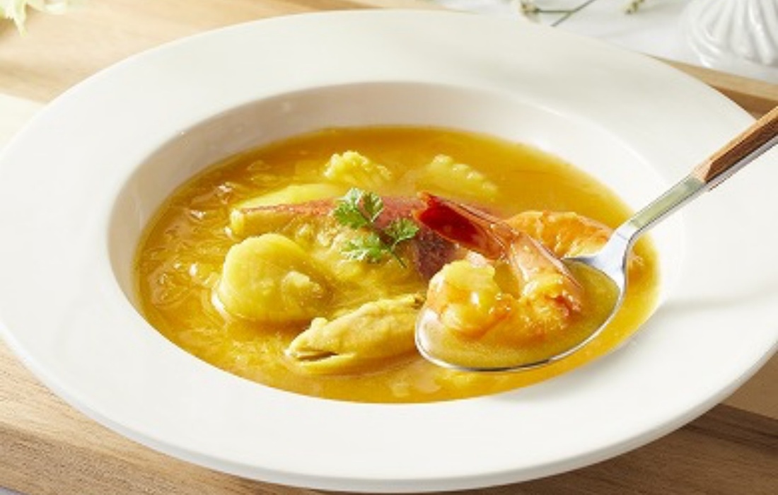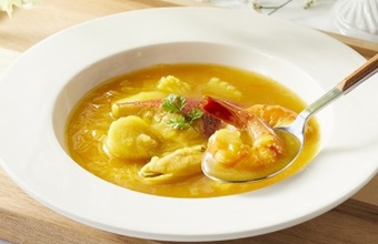 魚介類から出るエキスを充分に引き出したスープをベースに、丁寧に炒めたポロ葱とトマトを加えサフランで仕上げました。具材には金目鯛、ホタテ貝柱、エビ、いか、ムール貝を使用しており、魚料理としてもスープとしてもお楽しみいただけます。