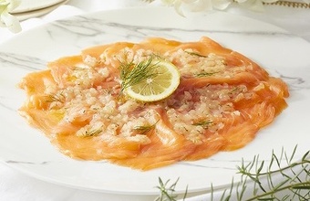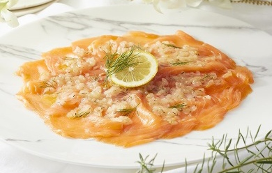 しっかり水分を抜くことで旨みが凝縮され、艶やかな飴色に仕上げています。そのままでも十分にサーモンの旨みを味わっていただけますが、付け合わせのオニオンマリネと和えてカルパッチョ仕立てに、サラダやパスタの具材に、また、ベーグルに挟んで朝食としてなど幅広いアレンジがきくのも魅力のひとつです。