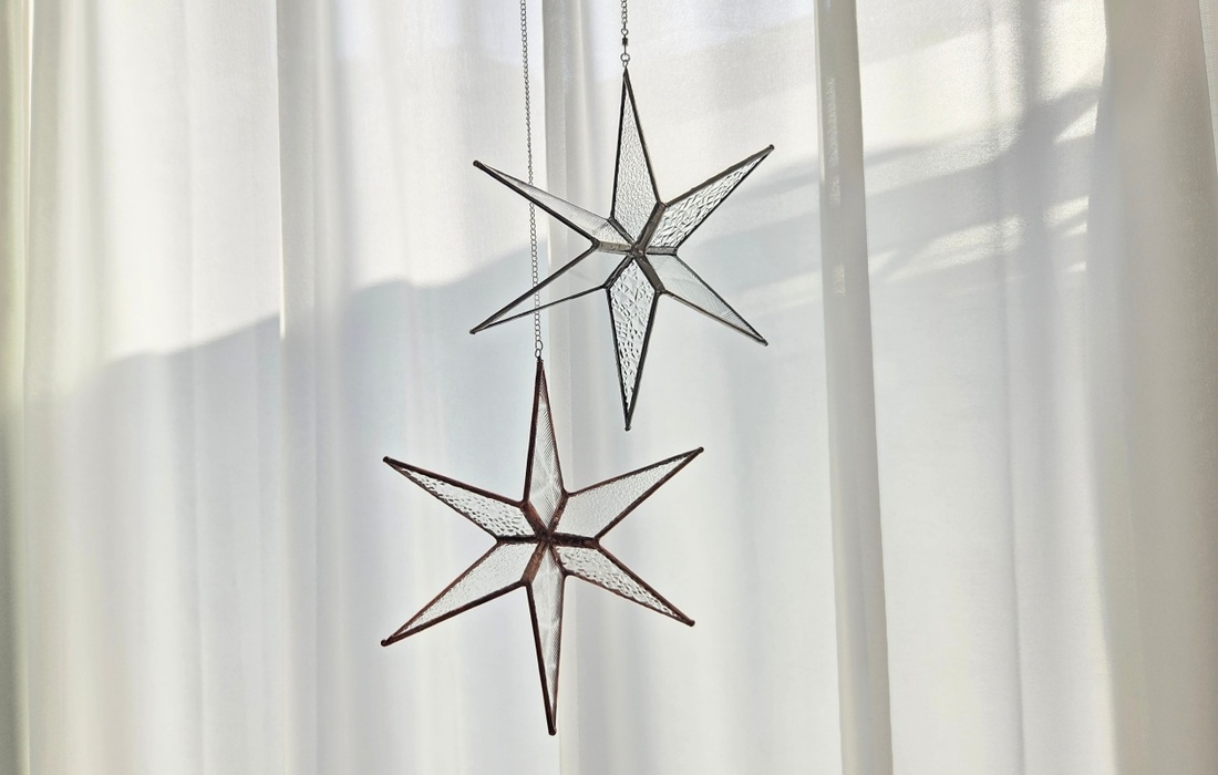 当コースでは、希少な昭和のデザインガラスを使って、星のサンキャッチャーを制作できます。ガラスピースの縁に銅テープ(銅製の粘着テープ)を貼り付け、そこに「はんだ」(低融点合金)を乗せてガラスピースをつなげていきます。「はんだごて」(はんだに熱を加えて合金接合するための工具)を思うように扱うにはコツが必要ですが、ステンドグラス作りに夢中になる工程のひとつです。現在は作られていないさまざまな模様のガラスを組み合わせ、はんだ部分を好みの色に染めて、世界に一つだけの作品を仕上げましょう。
