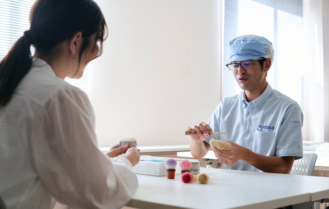 機械では難しい細部にまでこだわり、ほとんどの製造工程を手作業で行う晃祐堂(こうゆうどう)。見た目の美しさだけでなく、機能性・耐久性・安全性も兼ね備え、長く愛用できる道具としての筆づくりをしています。当コースは、そんな化粧筆工房にて、化粧筆づくりを体験できます。
