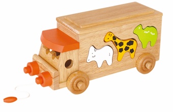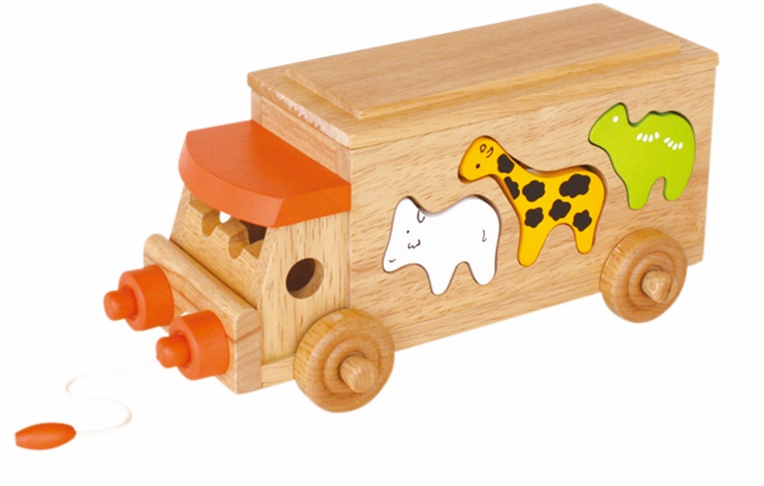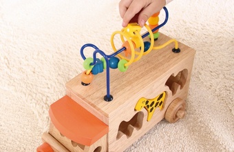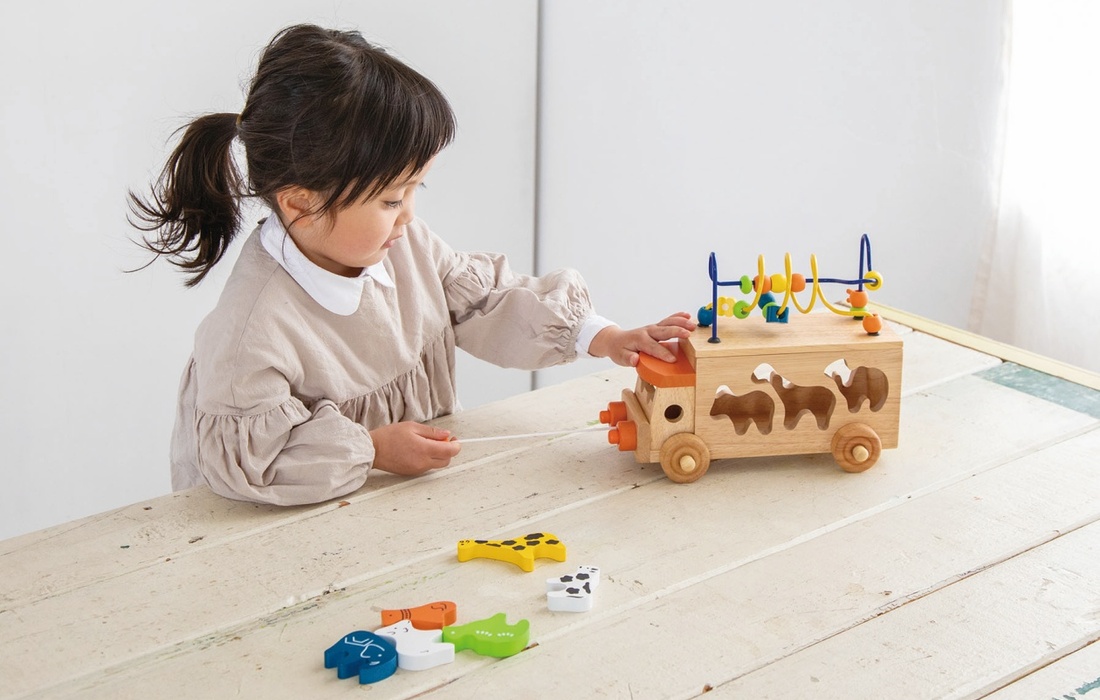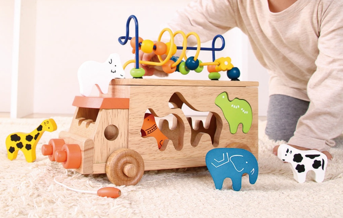 動物のかたはめパズルとビーズあそびができるよくばりプルトーイ。バスにはヤギ、キリン、カメ、イヌ、ウシ、ゾウの6匹の動物のシルエットがあり、形を認識しながらブロックをはめていきます。バスの上にビーズコースターをのせて、ビーズをクルクルと動かしたり、手先の器用性と集中力を養います。ビースコースターは バスの中に収納でき、動物ブロックはバスの後の扉から取り出すことができます。