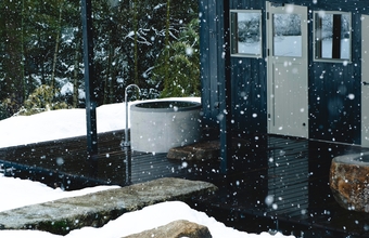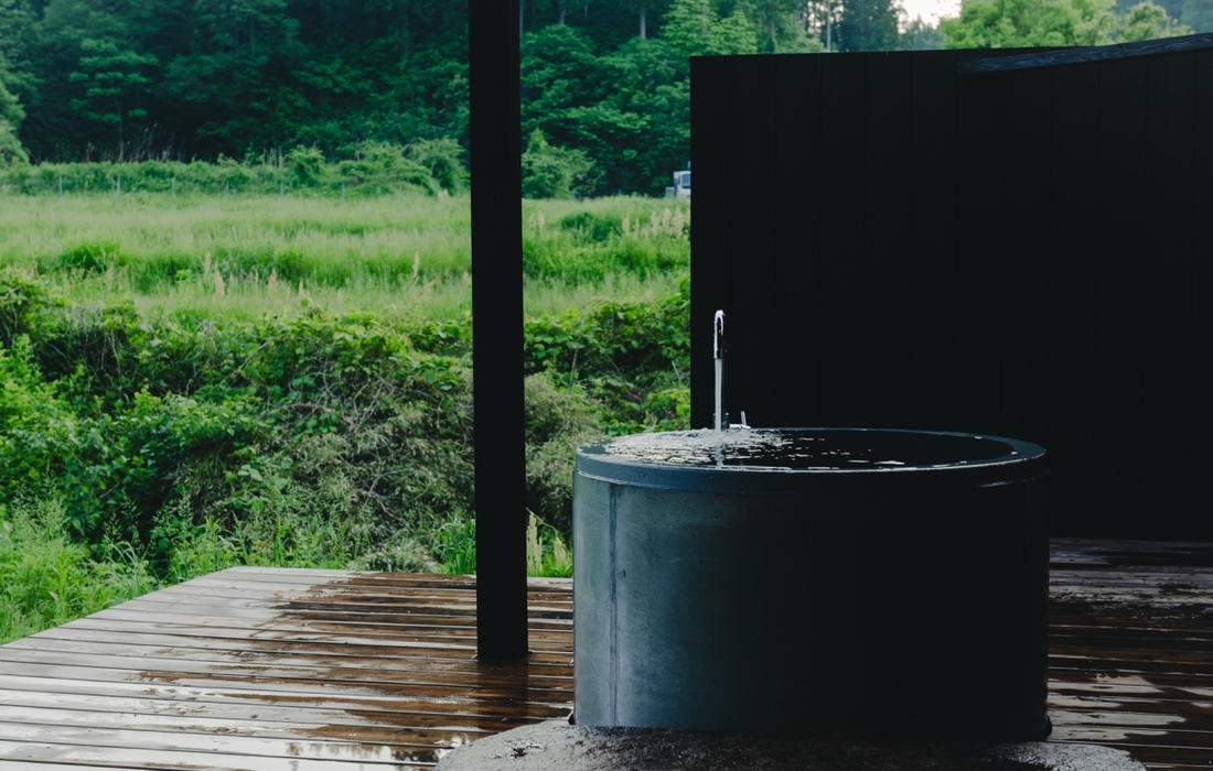 火照った体をしずめるのは、無骨なフォルムが愛らしいドカンを使用した水風呂。あふれる柔らかな水に包まれて、童心に帰るような開放感に満たされます。外気浴テラスでは、雄大な鞍掛山(くらかけやま)を正面に、里山を抜ける風を全身で感じることができます。冬の雄大な風景や、春から秋にかけての敷地内の小川での川遊びなど、季節にあわせたこの地ならではの過ごし方を楽しんでみてはいかがでしょうか。この村が目指す「自然と共生する未来」が、少しだけ見えてくるかもしれません。