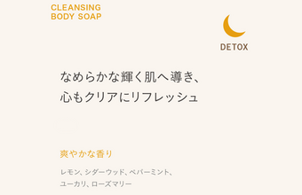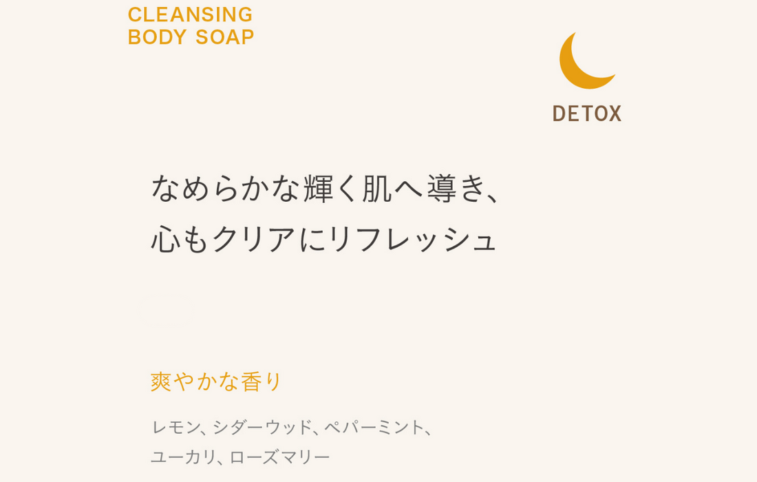 月の満ち欠けと私たちの日常の心身の変化とをインスピレーションとした「TO BE YOU.」のクレンジングボディソープは、アミノ酸系洗浄成分とAHA配合。角質ケアも優しく行えるボディソープです。レモン、ペパーミント、ユーカリなどのクリアな香りをお楽しみください。
