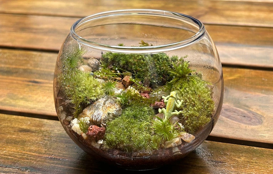 ガラスベースに数種類の苔を使って小さな風景を作るコースです。石や砂、ミニチュアなど添えて自分だけの景色を完成させましょう。