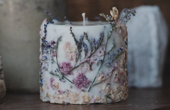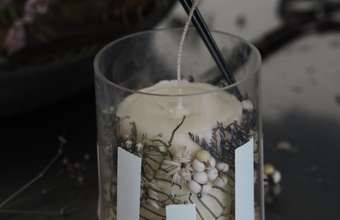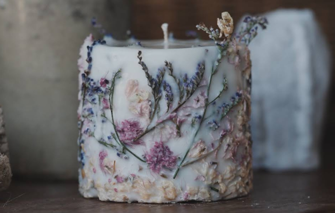 「ボタニカルキャンドル」はソイワックスを使用し、長野や山梨産のドライフラワーや、松本産のロスフラワーを好みのデザインに配置する持続可能なキャンドルです。
