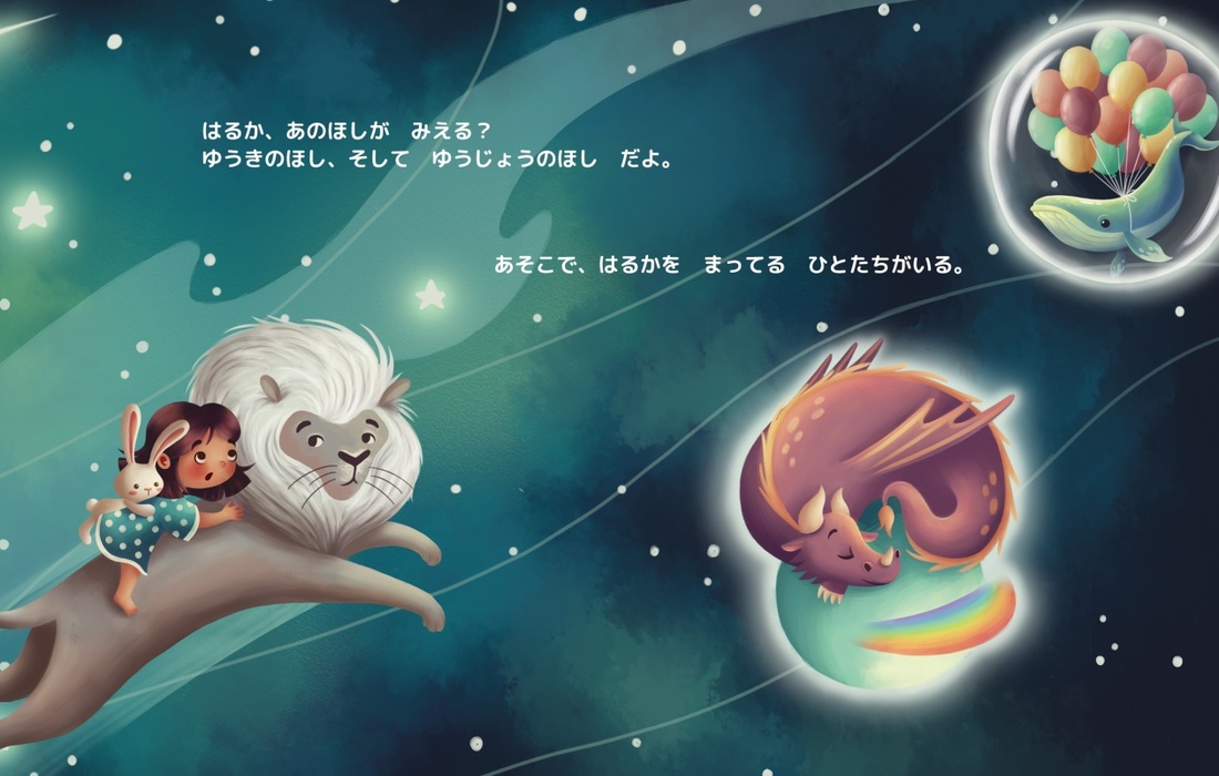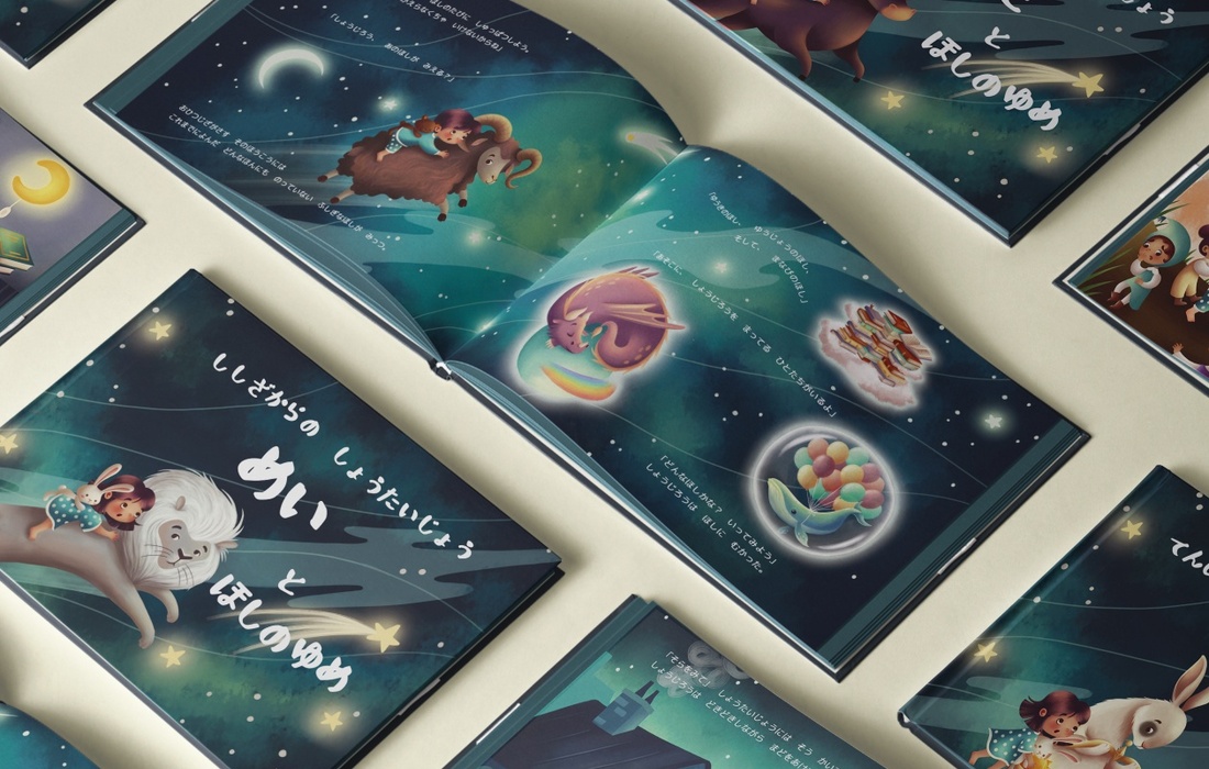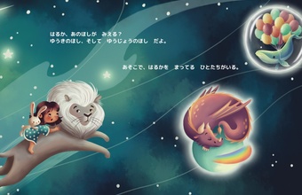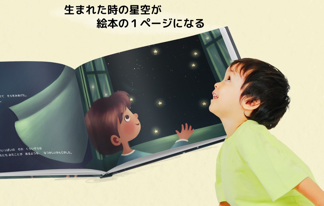 絵本の内容は主人公が星空を旅する冒険物語です。主人公となる子どもが冒険する場所は、「勇気の星」や「おもいやりの星」など6つの中から、訪れたい場所3つを自由に選ぶことができます。主人公と一緒に冒険するキャラクターは誕生日にあわせて変わります。出生時間・出生地をもとに生まれた日の星空が絵本の中で再現されるため、文字通り世界にひとつの絵本が作れます。