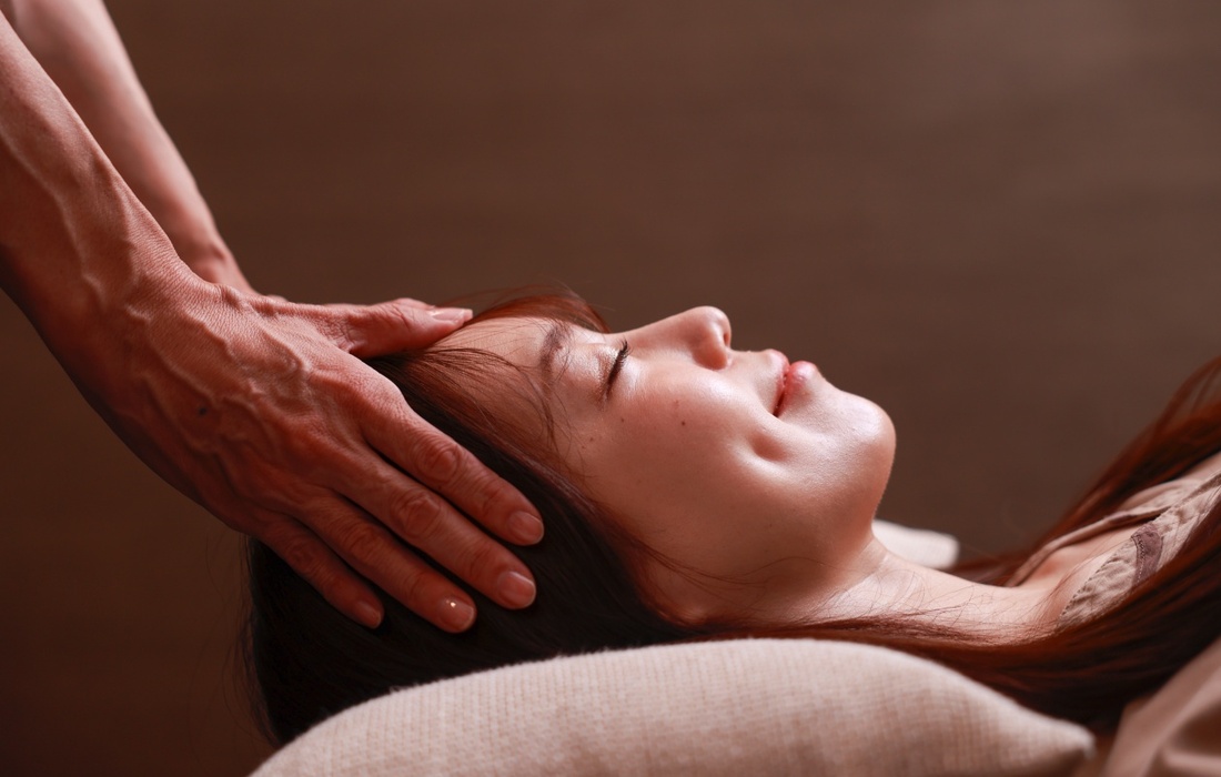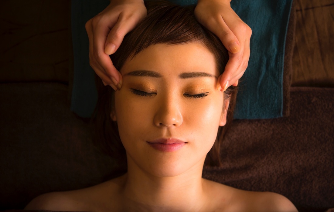 デコルテから首・肩、最後は頭・顔周りにかけて、オールハンドで丁寧にほぐします。顔や頭のツボをゆっくり押しながら、疲れが溜まりやすい目元の緊張を緩めていきます。施術中は、目元を温めるホットパックを使用。ゆるめた目元をほどよく温め、リラックスへと導きます。