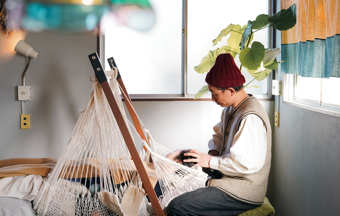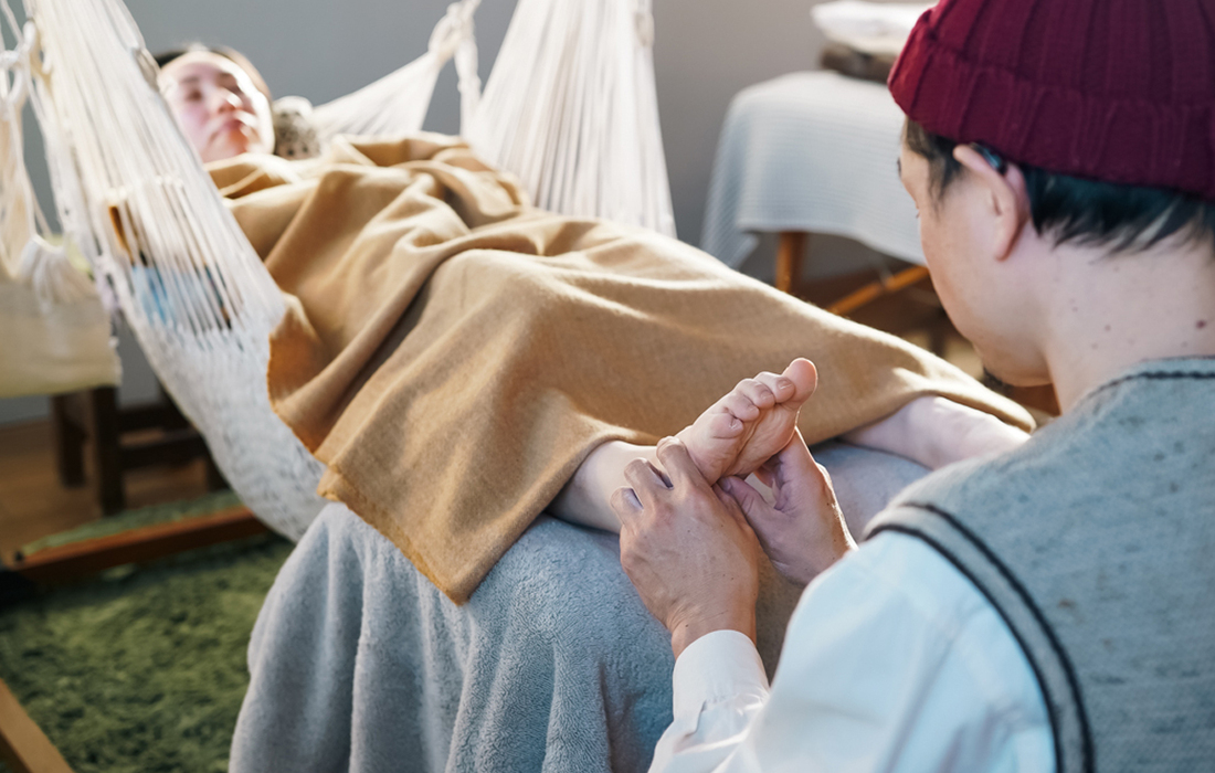 ハンモックにくるまれた瞬間、リラックスモードのスイッチがカチリ。カラダの力がフワッと抜ける。ハンモックの心地よさと、イタ気持ちいい刺激で身体を整えるリフレクソロジーを掛け合わせたハンモックリフレ、足だけでなく手と頭も行います。ハンモックの魅力を思う存分堪能できるコースです。また、施術時に使用するパウダーに入れる精油はお好みの香りを選べるので、その日の気分に合う香りを選んでください。