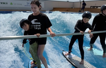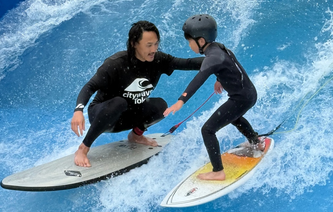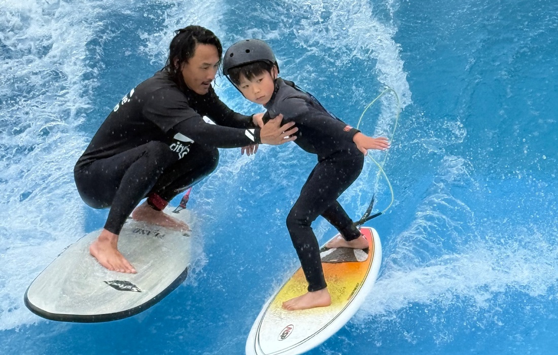 初めは補助バーを使った練習からスタートし、慣れてきたら一人ずつ波乗りに挑戦。インストラクターの丁寧なサポートがあるので、初めてでも安心してチャレンジできます。