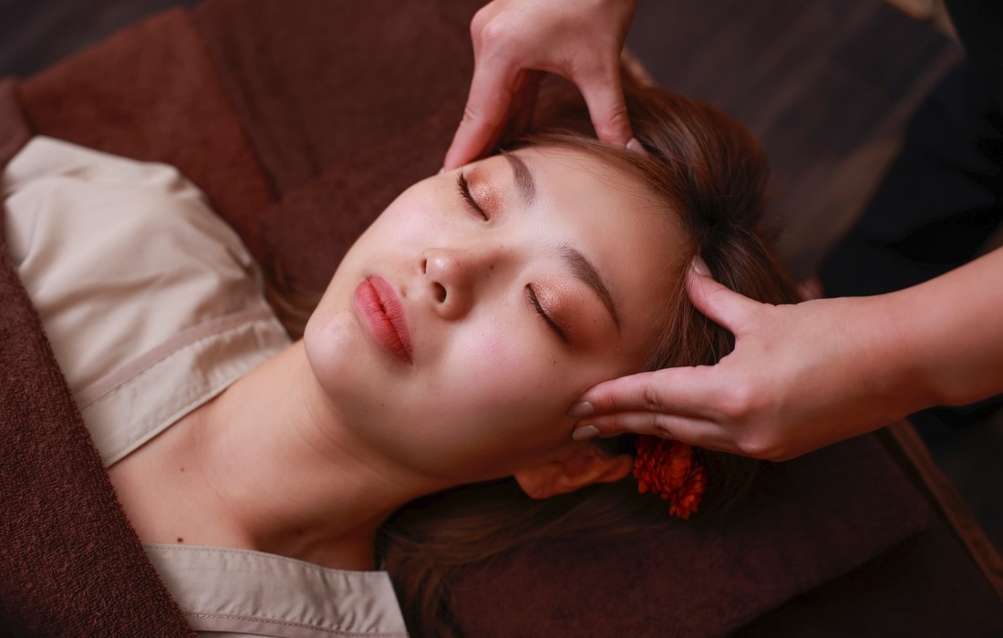 当コースでは、頭のコリをほぐすドライヘッドスパに加え、お好みに合わせて施術を選べるのが魅力です。ひとつは、圧をかけてコリをほぐす手技とヨガストレッチを組み合わせたタイ古式ボディケア。もうひとつは、タイの高級スパブランド「HARNN(ハーン)」のオイルを使用し、数種類の中から気分に合う香りを選べるアロマオイルトリートメント。お好みの施術を組み合わせることで、全身をゆるやかにリラックスへと導きます。