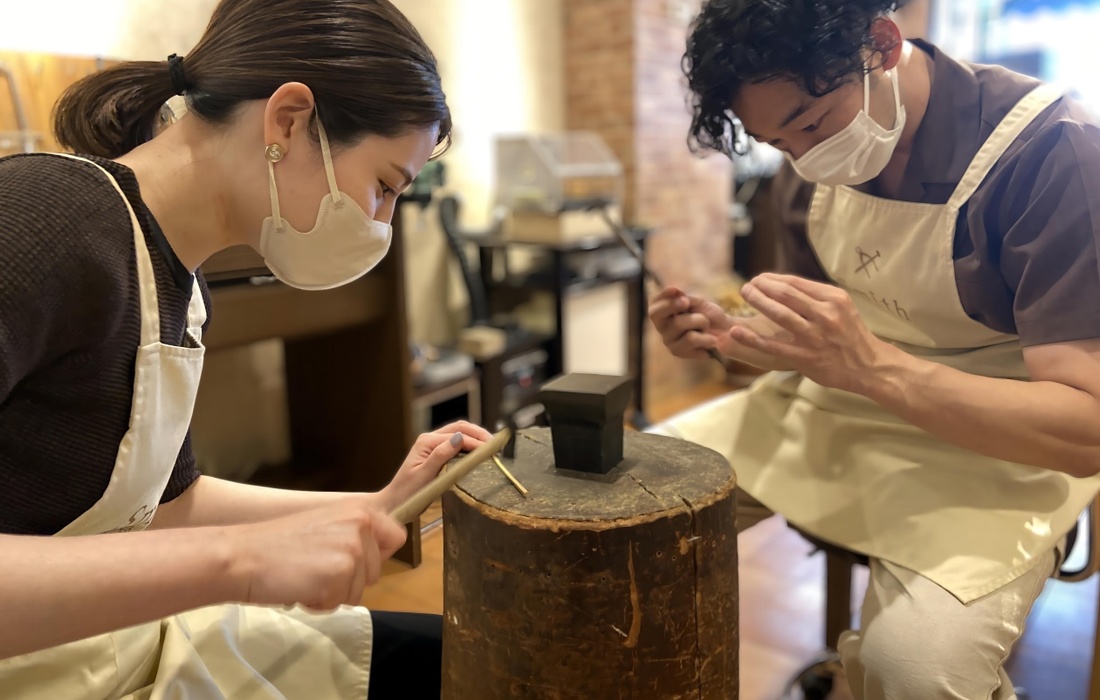 指輪の制作体験ができる「東京工房スミス」。当コースは、東京・南青山にある青山店にて、2人で手作りのバングルを作ることができます。1組限定のプライベートな空間で、カップルや夫婦での体験はもちろん、友人同士での参加も歓迎です。