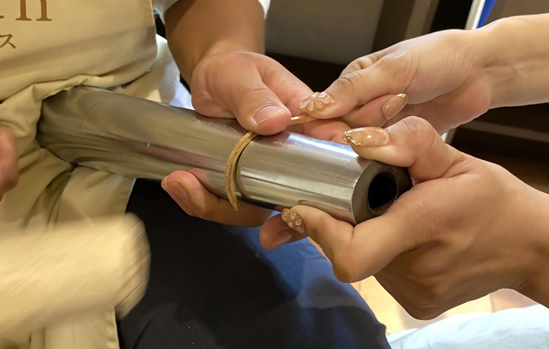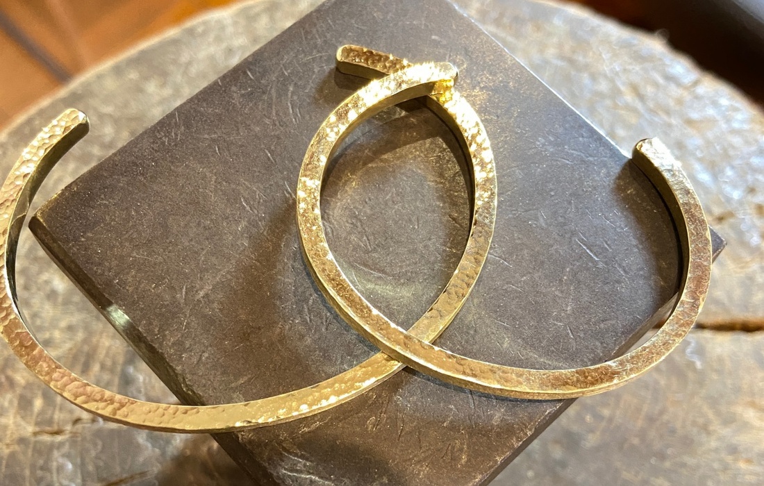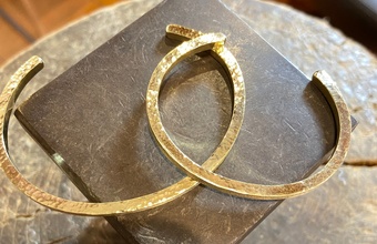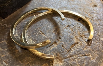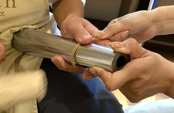 体験では、ジュエリー専門学校を卒業した知識豊富なスタッフがしっかりサポート。 作業机は職人が使用する本格的な彫金机を採用しており、バングル作りに最適な環境です。素材は真ちゅうを使用。手作業で形を整え、磨き上げることで、温かみのある輝きを持つオリジナルバングルに仕上げることができます。