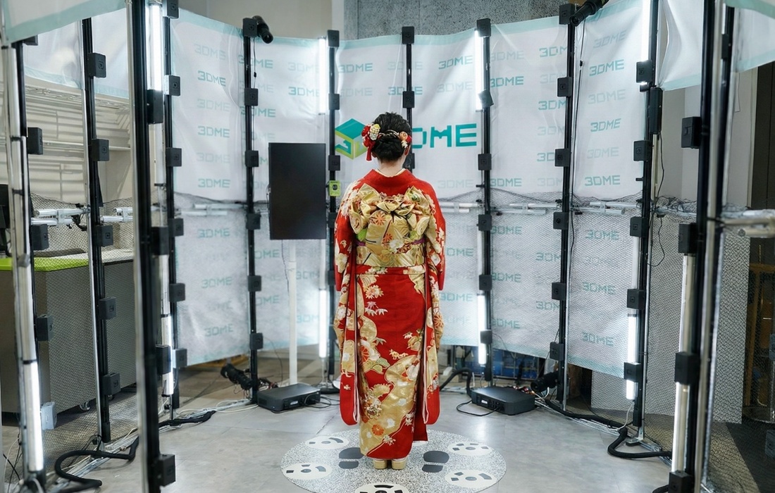 円柱状の撮影ブースに入ると、わずか1秒で全身の3Dスキャン撮影が完了します。その場で3Dモデル化された簡易データを確認し、体験は終了です。