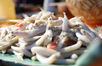 琵琶湖の西岸にある和邇(わに)漁港から漁船に乗り込み、まだ真っ暗な湖へと出発。漁船ならではの臨場感を味わいながら湖面を駆け抜け、琵琶湖の伝統漁法「エリ漁」のポイントまで船で移動。1000年以上続くと言われるエリ漁の解説を聞いた後、1つ目の網を引き上げます。1時間ほどの漁の後、2つ目のエリへ移動し、さらに網を引き上げます。どんな魚がどのくらい穫れるかは、季節やその日の環境次第。自然の恵みや厳しさを体験できる瞬間です。