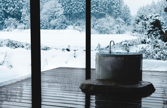 火照った体をしずめるのは、無骨なフォルムが愛らしいドカンを使用した水風呂。あふれる柔らかな水に包まれて、童心に帰るような開放感に満たされます。外気浴テラスでは、雄大な鞍掛山(くらかけやま)を正面に、里山を抜ける風を全身で感じることができます。冬の雄大な風景や、春から秋にかけての敷地内の小川での川遊びなど、季節にあわせたこの地ならではの過ごし方を楽しんでみてはいかがでしょうか。この村が目指す「自然と共生する未来」が、少しだけ見えてくるかもしれません。