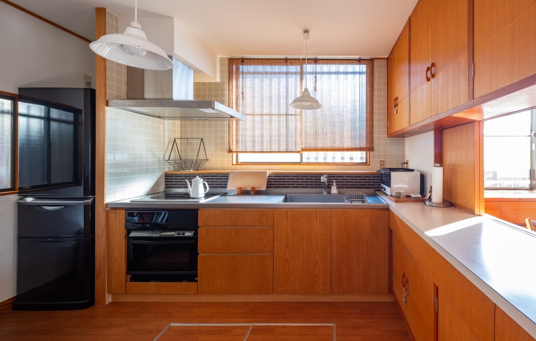 ・冷蔵庫・IHコンロ・電子レンジ・トースター・オーブン・炊飯器・ケトル・基本的な調理器具(鍋・フライパン)・ホットプレート・卓上コンロ・食器・カトラリー(箸・フォークなど)・コップ・グラス・ワイングラス・ワインオープナー・簡単な調味料(塩、コショウ)・ラップ・アルミホイル