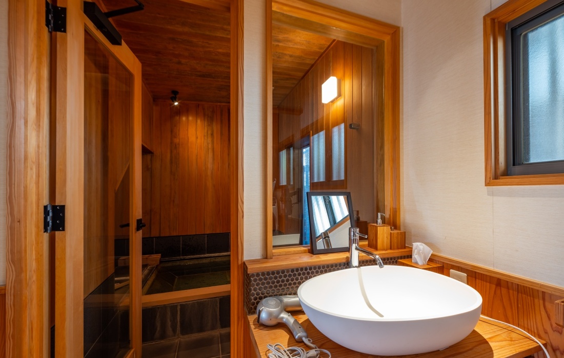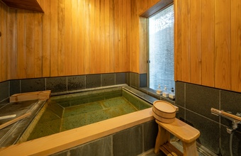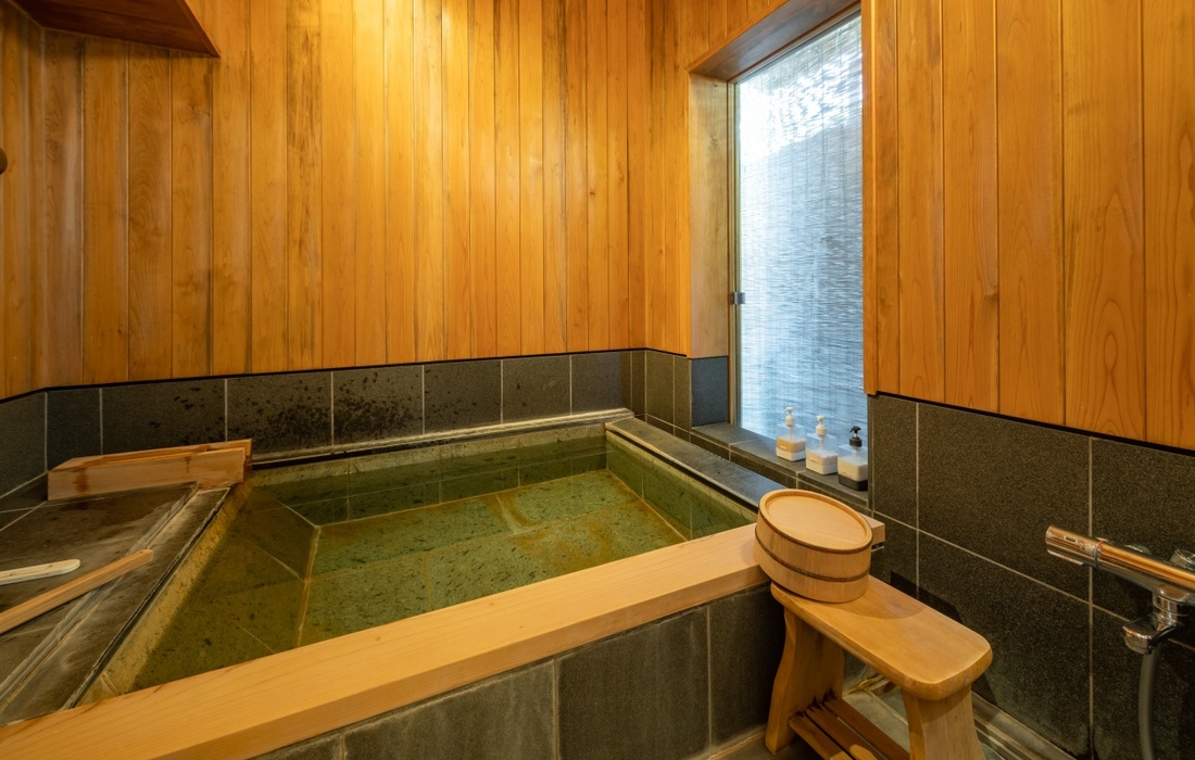 お風呂は、源泉掛け流しの天然温泉。窓から見える小さな庭園にはたくさんの樹木が茂り、四季折々の表情を見せてくれます。