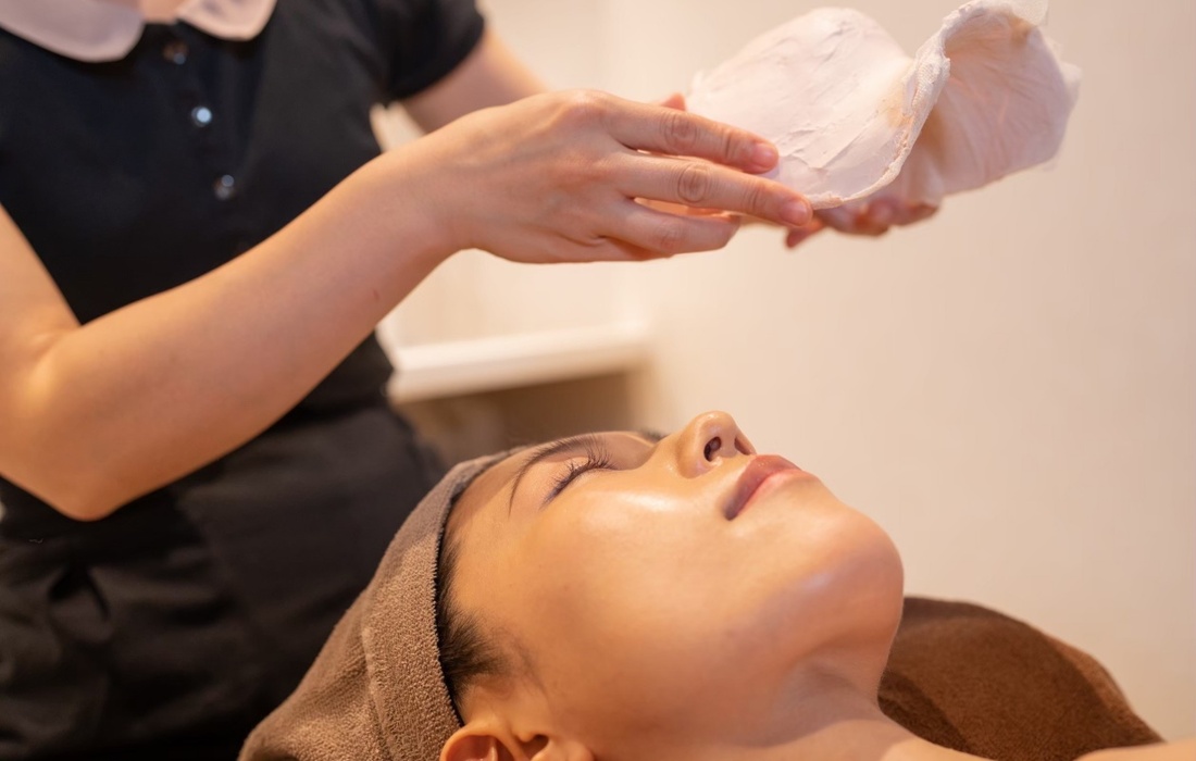 フェイシャルは、オールハンドで行うレイア独自のケア。美白成分配合のジェルで肌のめぐりを促し、50種類以上の美容成分配合美容液で整えた後、石こうパックを使用。石こうが少しずつ固まる過程で温度が40〜42度まで上昇、温熱効果で肌をやさしく温めます。