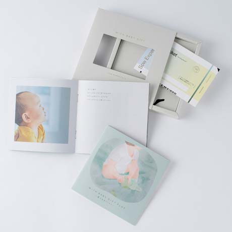 柔らかい色合いのギフトボックス。中央の窓からは冊子の表紙が見え、期待感が高まります。