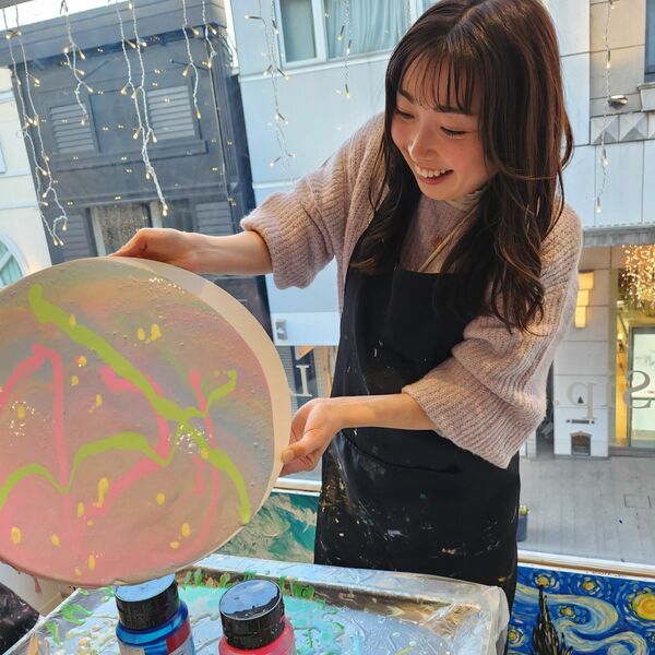 以前からアートには興味はあったが、芸術センスはないという自覚があったので、初心者でも出来るたらし込みアートは私にピッタリでした。1人参加でしたが、他の参加者も声を掛けて下さり、スタッフも優しく素晴らしい体験になりました。自分の作品が手元に届くのが楽しみです。